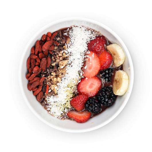 Açai Püree, getoppt mit frischen und saisonalen Früchten, Kokosraspeln, Knusper-Müsli und Chia Samen.
